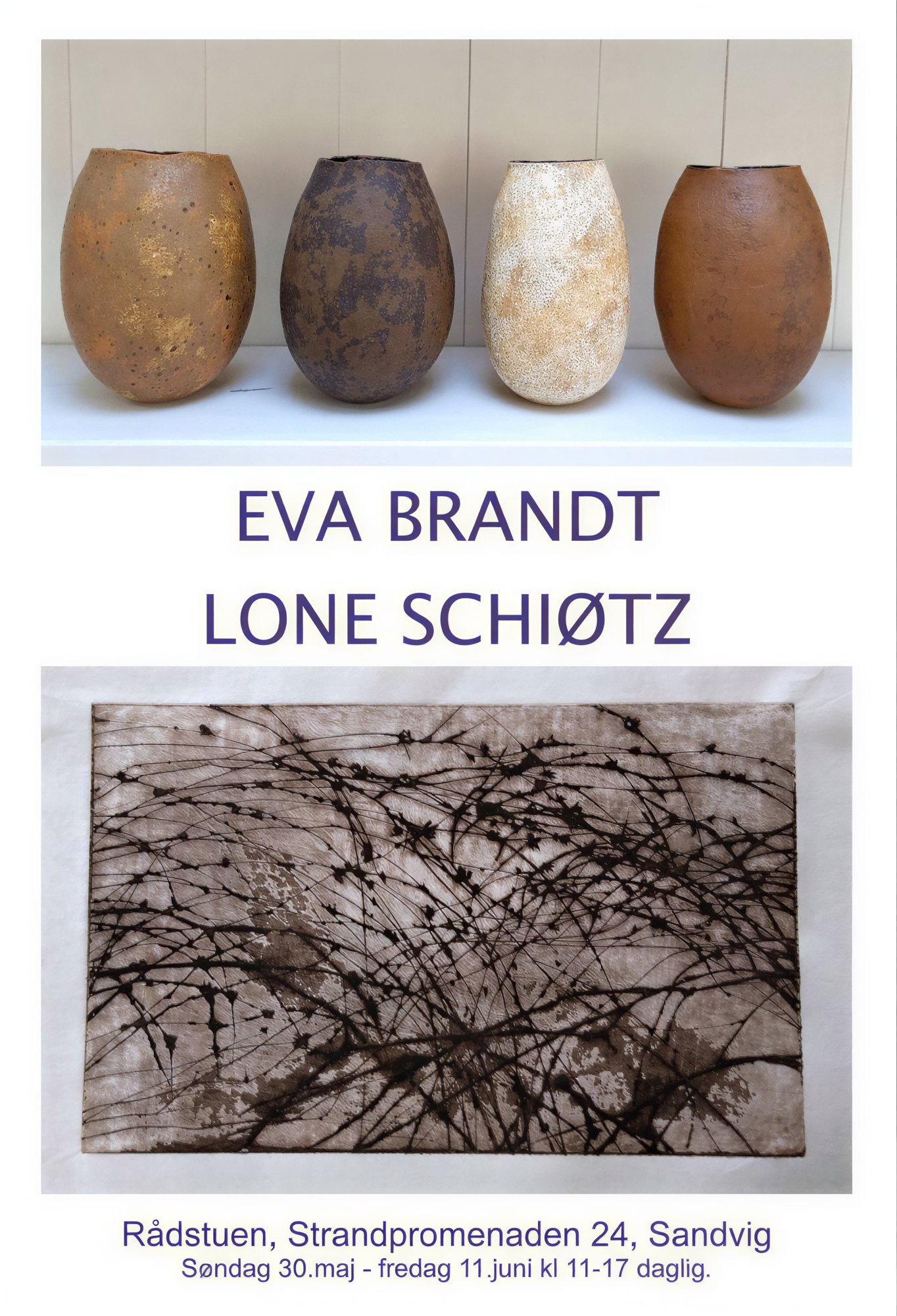 Udstillingen er åben dagligt kl 11-17 til og med fredag 11 juni, og en af os eller begge vil være til stede og passe udstillingen..