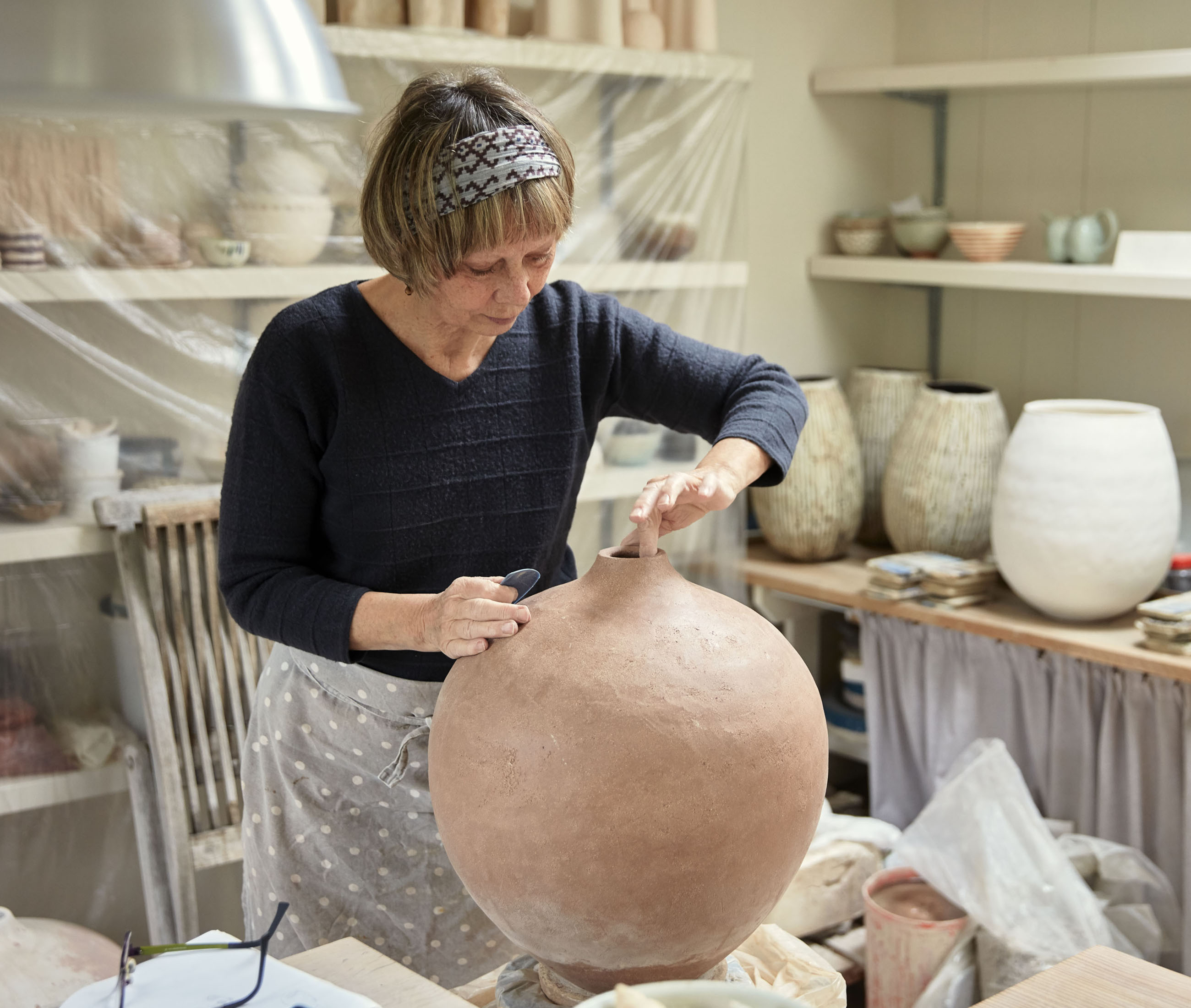 Jeg arbejder nu bl.a.med store modellerede krukker og fade i groft ler med rå kridtagtige begitninger på klippeagtige overflader og indlagte grafiske mønstre. Ofte inspireret af livet i havet, træers bark, geologiske aflejringer, kontraster mellem råt og forfinet. Jordens geologiske historie sætter gang i fantasien. Formsproget er helt enkelt. Farverne er oftest jord-agtige.